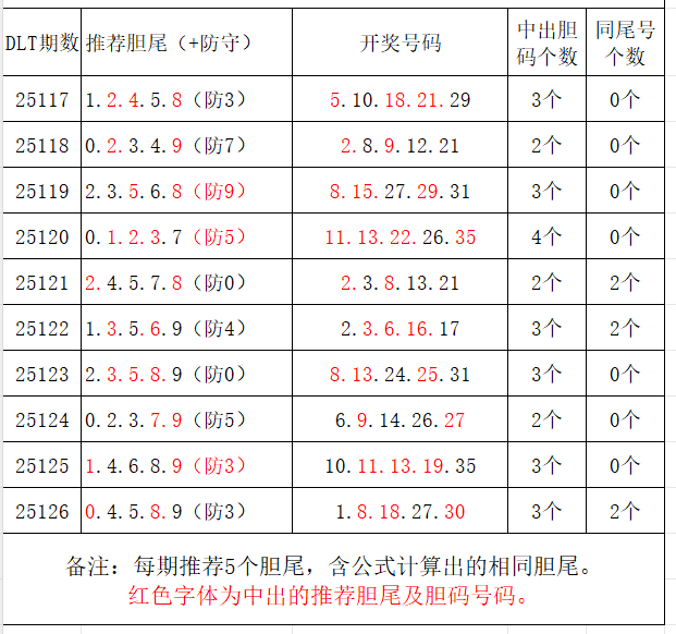 分享第三个数据分析:依据推荐的胆尾,推定胆码号码。每期计算出5个胆尾,做为推荐胆尾。以近10期推荐胆尾的统计数据为例: