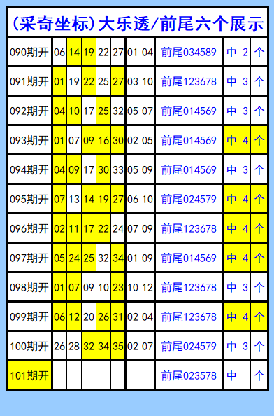 大乐透第101期图文(采奇坐标),前尾六个展示