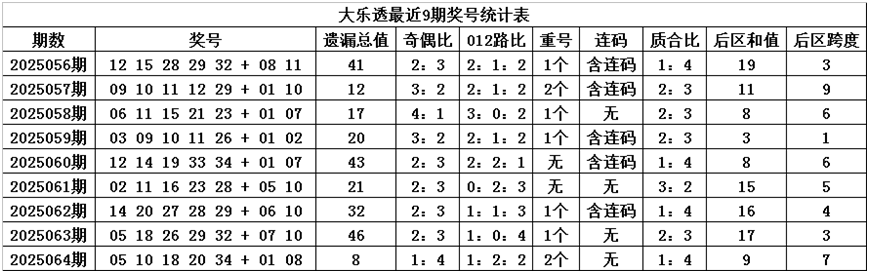 马姐大乐透第065期:前区胆码6期5次正确,本期前区龙头防连码