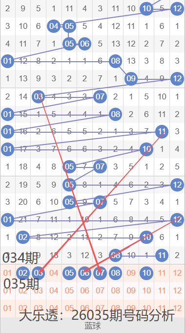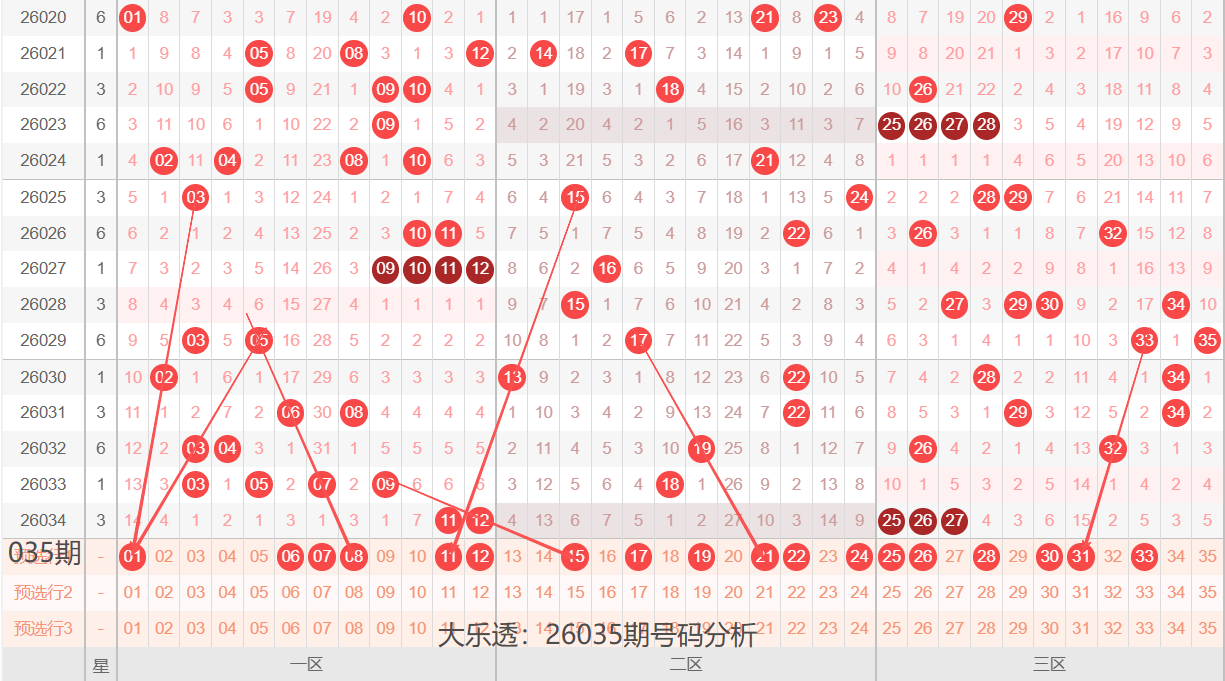 通过上期号码的简单分析,我们看下26035期红色号码球的总体走势,如下图: