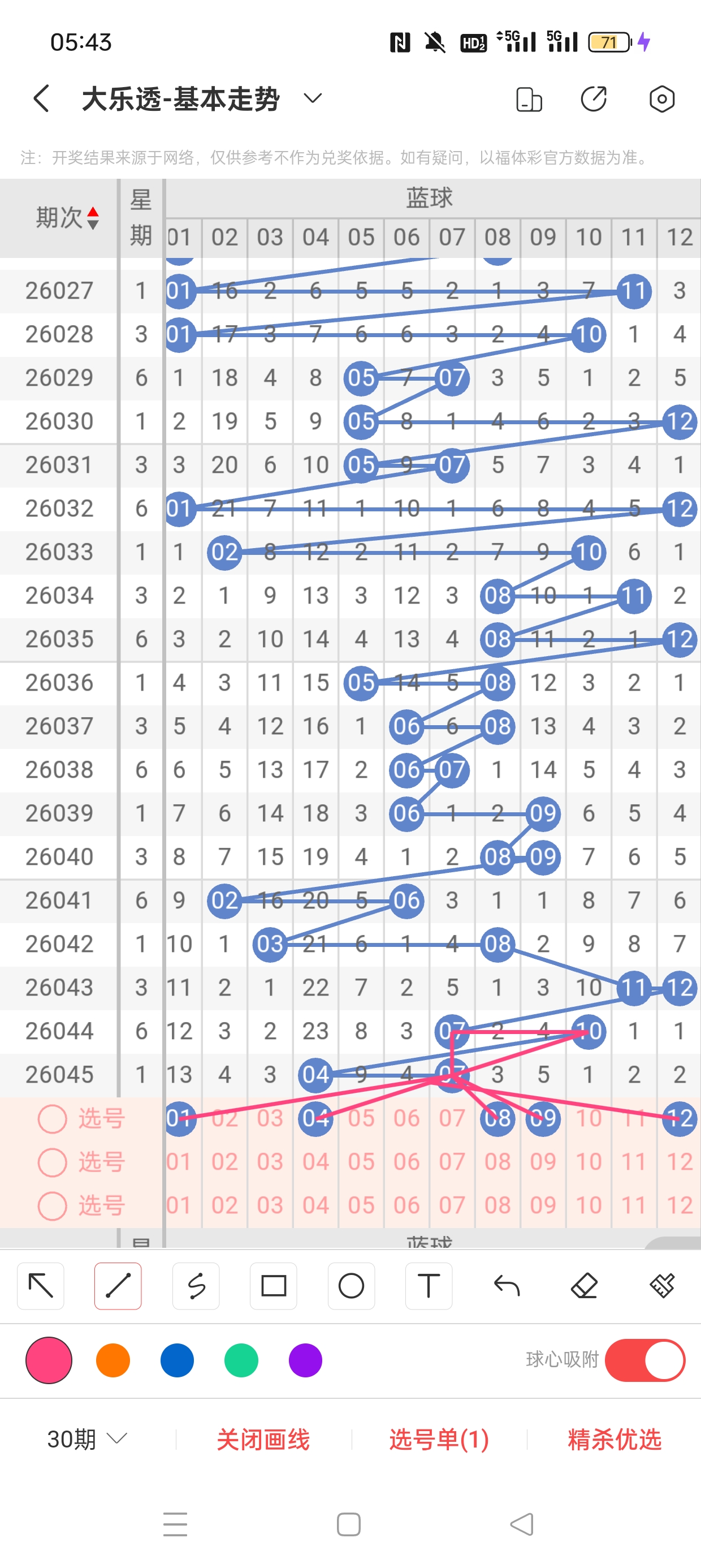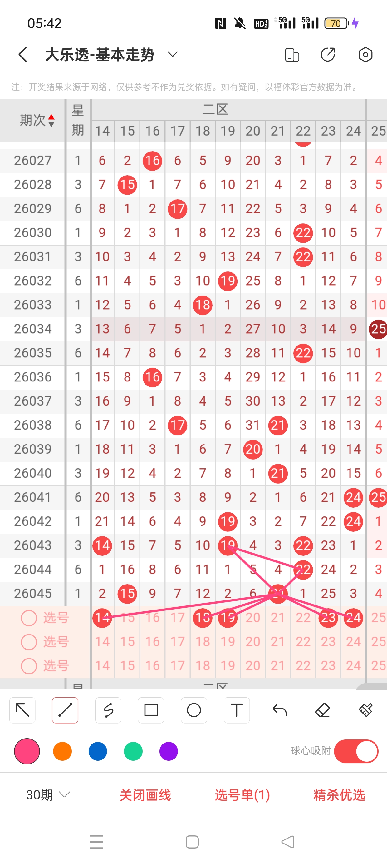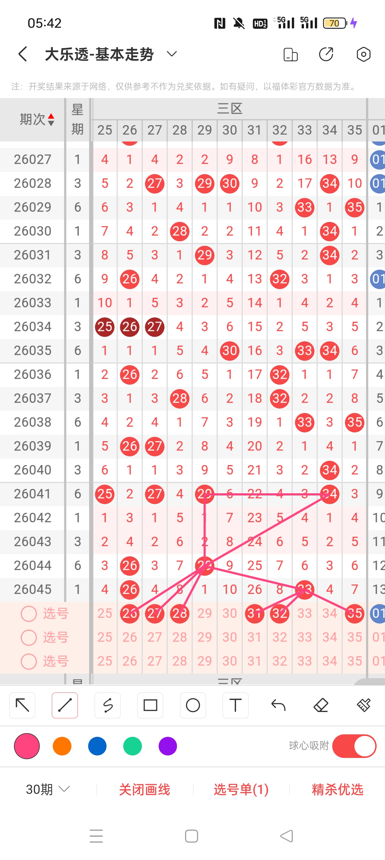 26045期开奖结果:1、15、21、26、33+4、7,奇偶比4:1,大小比3:2,和值96,012路311,邻孤传0邻4孤1传,同尾号1、21,传号26,连号无。总结完毕,下面开始本期分析。