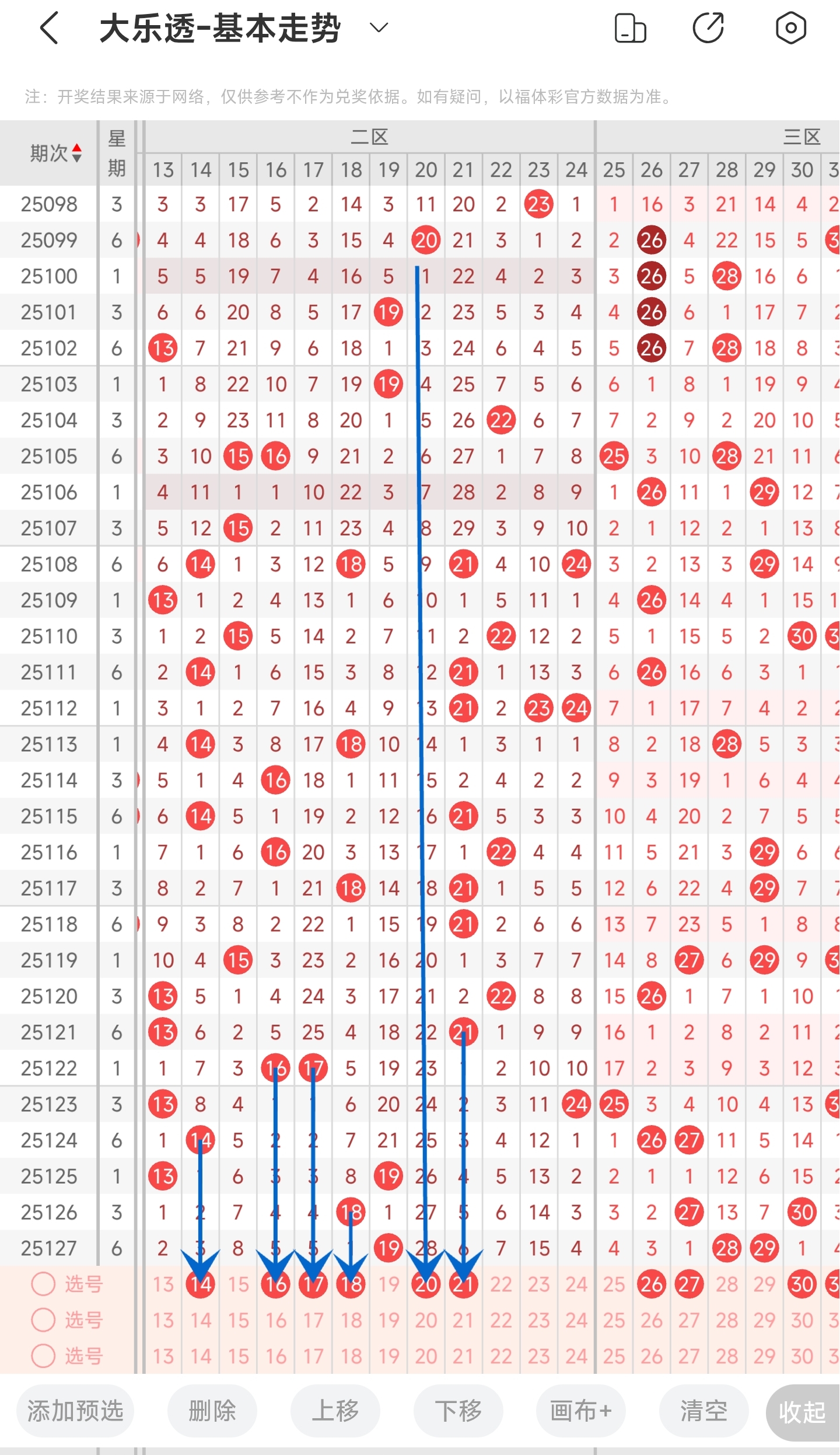 上一期开出了19号球,往前一期开出了18号球。通过分析走势图,可以看到近3期二区开出的号码都是在中间的位置,推测本期有较大的概率继续开中间的号码,所以本期继续关注中间的号码,其次是防一下左边的号码开出。最后再结合遗漏情况和冷热号,本期我们可以关注141617182021等号。综上所述我们可以推测本期可能会开出有141617182021等号码。