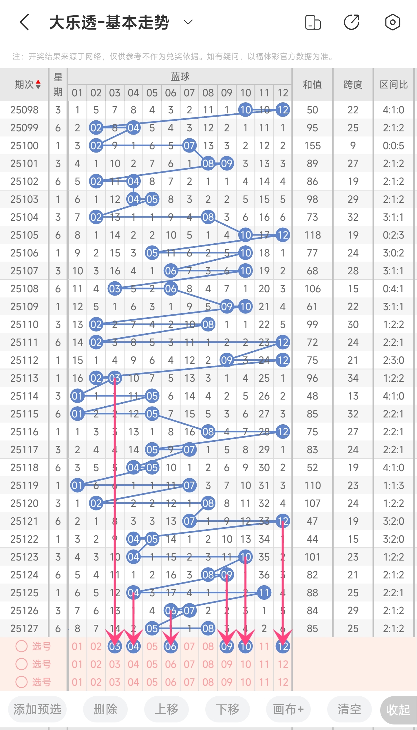 上期开出了58号球。往前一期开出了67号球。通过分析蓝区走势图,我们可以看到蓝区开出的号码跨度整体大多数情况下基本遵循一大一小这样子开。上期开出的跨度较前一期是大跨度。但本身其跨度比较小,本期跨度有可能继续变大,也可能变小。所以本期大小跨度都要考虑一下。然后再结合冷热号情况以及遗漏期数,本期我们可以关注34691012等号。综上所述本期我们推测可能开出34691012等号码。