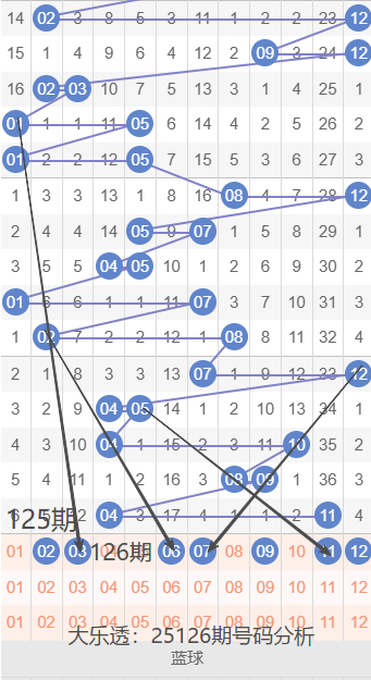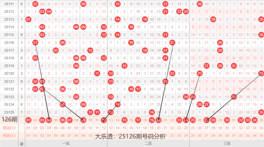通过上期号码的简单分析,我们看下25126期红色号码球的总体走势,如下图: