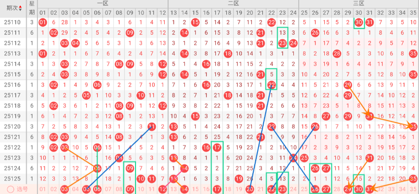 三区(25-35)分析:上期该区开出号码 26 27,近10期占比24%,与上期相比无变化。本期无三斜连号趋势,隔码斜连走势:26。在经历两连断后虽有所回升,但上期又缩量至1码,表明三区出号量从低位回升。 推荐关注号码:26、27、29、30、31。