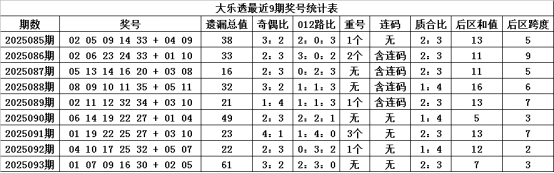 后区跨度:后区近9期跨度分别开出5-9-5-6-7-3-7-2-3,跨度奇偶比为7:2,上期跨度上升1个点位,本期看好跨度继续上升,预计开的偶数跨度,关注跨度4。