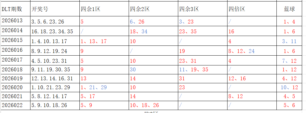 分享第一个数据分析:四分区统计数据。相对于传统的三分区,个人习惯使用四分区,就是把35个红球号码除以4,所得的余数分区如下: