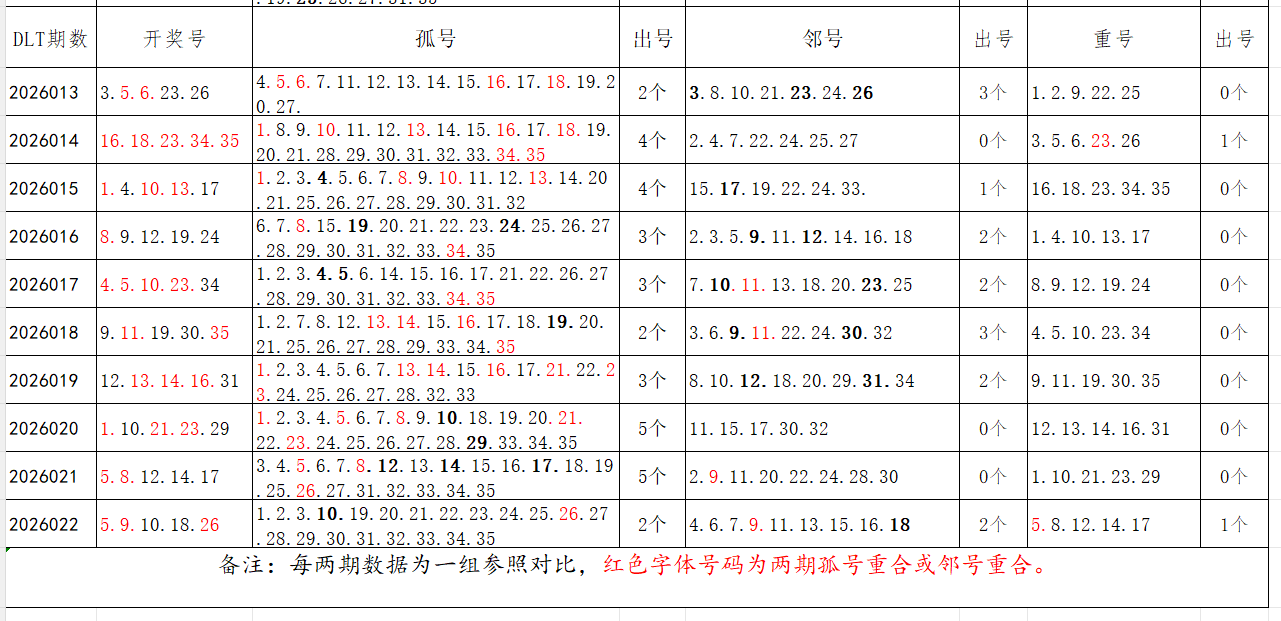 如图,以近两期数据为一组,进行对比分析,相同的孤号、邻号可能在下期开出。本期参考孤号:1.2.3.7.12.13.14.15.16.20.21.22.23.24.28.29.30.31.32.33.34.35;邻号:4.6.8.11.17.19.25.27。重点关注:孤邻号重合号码:***(会员专区可见)。个人分析,仅供参考。