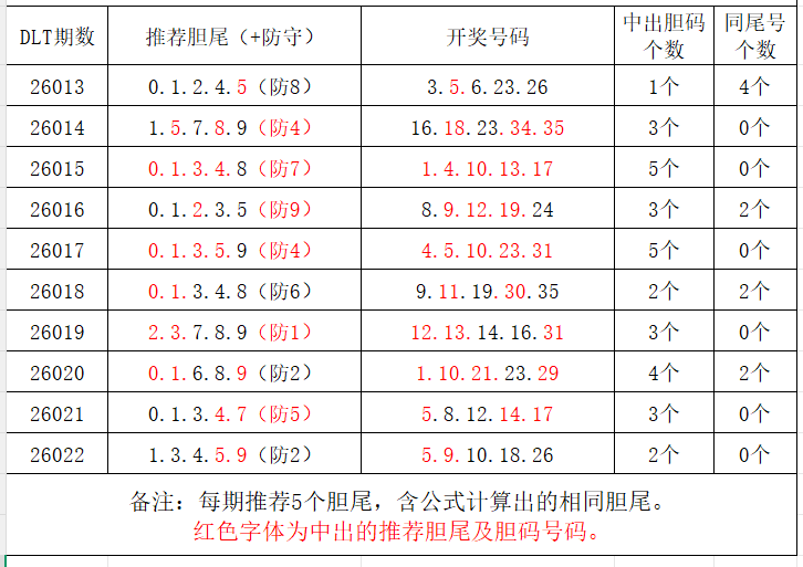 分享第三个数据分析:依据推荐的胆尾,推定胆码号码。每期计算出5个胆尾,做为推荐胆尾。以近10期推荐胆尾的统计数据为例: