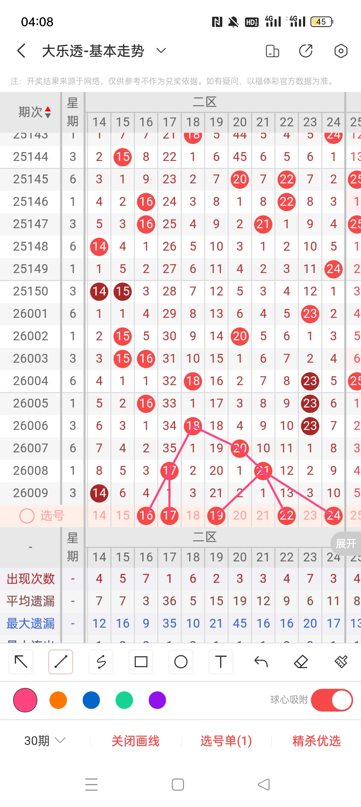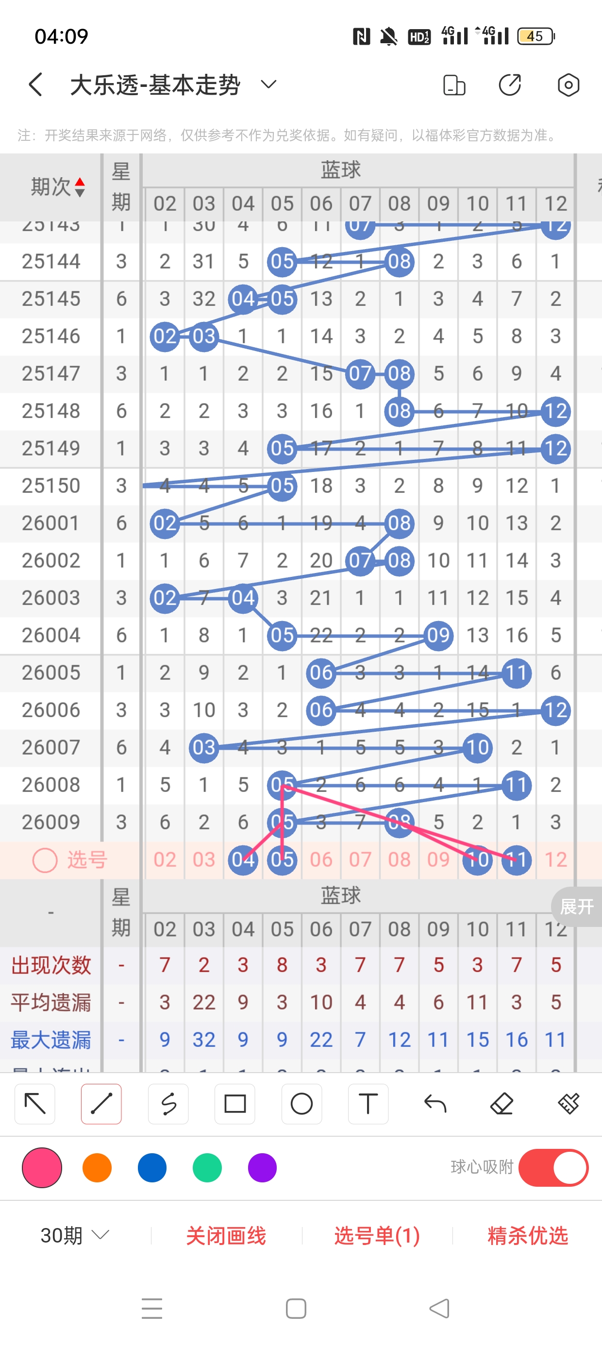 26009期开奖结果:5、12、13、14、33+5、8,奇偶比3:2,大小比1:4,和值77,012路212,邻孤传0邻4孤1传,同尾号13、33,传号33,连号12、13、14。总结完毕,下面开始本期分析。