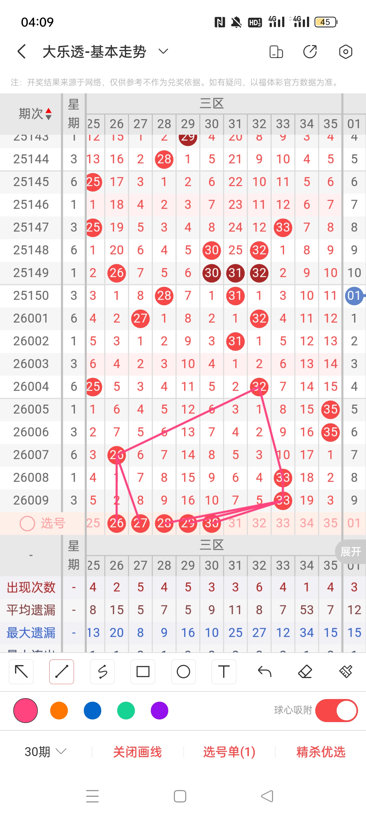 三区(25-35)近13期本区邻孤传3邻10孤0传,孤号热度高,本期着重邻传。近13期本区012路0:3:10,2路热度高,本期着重0/1路。26、27分别遗漏2期、8期,两者与26之间呈现向右对称遗漏递减态势,需防。28、29、30分别遗漏9期、16期、10期,三者与33之间呈现向左遗漏递减态势,需防。