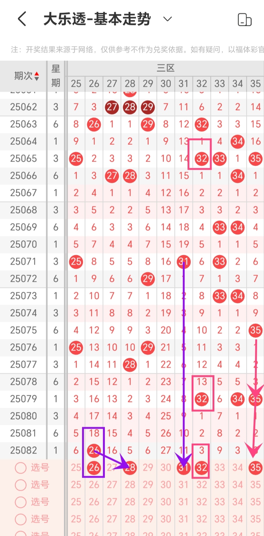 通过对同日期重号出现的数量规律进行统计分析,本期考虑出号0-1个,即02-09-17-26-32出号0-1个