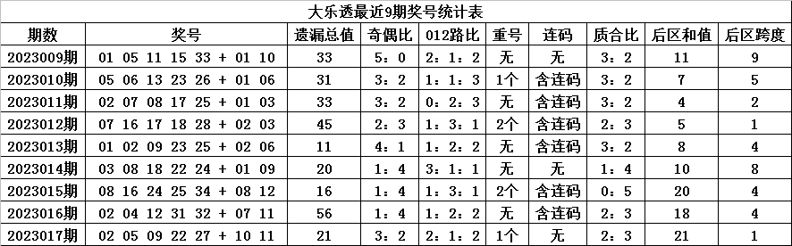 体彩大乐透第2023017期奖号为:02 05 09 22 27 + 10 11,各位号码遗漏期数分别为:0期、6期、3期、2期、10期+7期、0期,前区号码遗漏总期数为21期,012路比为2:1:2,奇偶比为3:2,包含1个重复号码:02。后区号码遗漏总期数为7期,和值为21,跨度为 1。
