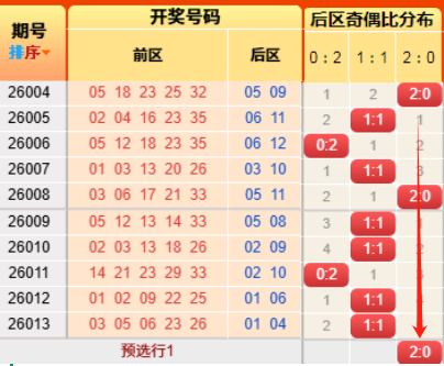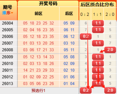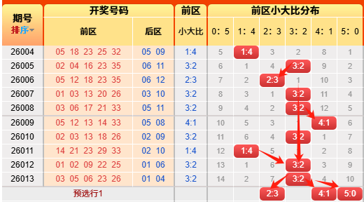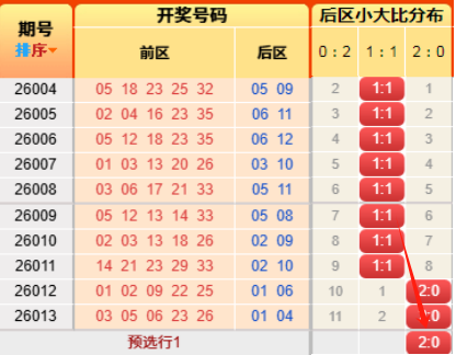 上期前区小大比3:2。言归正传我们继续用历史数据说话,前区小大比分成6051423324150(如图),我统计了一下历史出现次数,05出现107次、14出现516次、23出现979次、32出现819次、41出现356次,50出现54次,再看近10期小大比出现次数比为021610,通过历史数据对比观察以及根据遗漏对称理论原则,故本期我们选择4:1、5:0、2:3(具体精准方向请查看小车小大比精选)