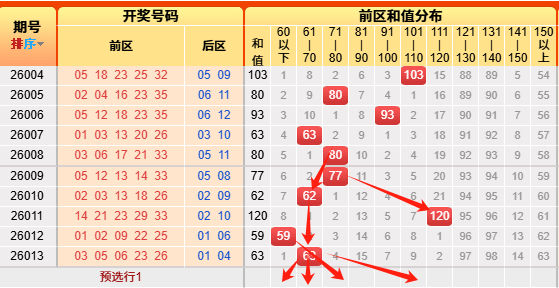 上期开出和值62。本次我们先根据历史次数统计,和值60以下开出251次、61-70开出238次、71-80开出374次,81-90开出488次、91-100开出499次,101-110开出383次、111-120开出314次、121-130开出155次、131-140开出90次、141-150开出27次、150以上开出9次,再来看近十次以上和值分别开出了1次、3次、3次、0次、1次、1次、1次、0次、0次、1次、0 ,低于阈值的有60区间以下、61-70区间、81-90区间、91-100区间、101-110区间、121-130区间,再根据遗漏斜率对称理论,本期注意71-80区间、61-70区间、60以下区间、101-110区间。