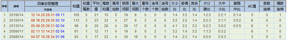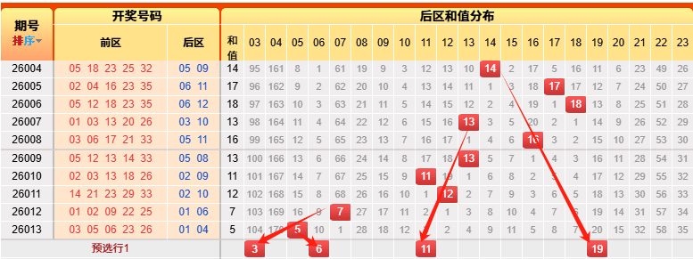 接下来我们来看前区小大、奇偶、质合、和值分布图: