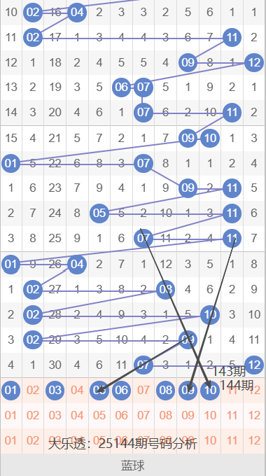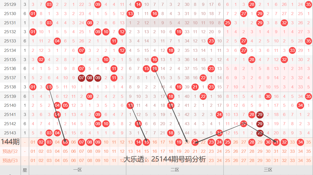 通过上期号码的简单分析,我们看下25144期红色号码球的总体走势,如下图: