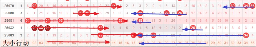 如图所示:体现的是3个局部走势的发展周期,圆圈为密集处的填空,本期定性为新局部走势第1期,画线期,造成号码密集,主动调整空间,即1-12和20-34空间需要调整。则号码或密集在2区。由于上期交换首尾,本期不要求交换,即要么号码推到左边,要么号码推到右边,均或出现断区,平衡起号号码挂中间则不出现断区。代表本期邻重都有,小跨布局。