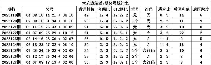 后区和值:上期后区和值开出8,和值重复出现,近9期和值分别开出:14、11、10、22、9、16、10、8、8,本期注意和值上升,预计出现在11附近。
