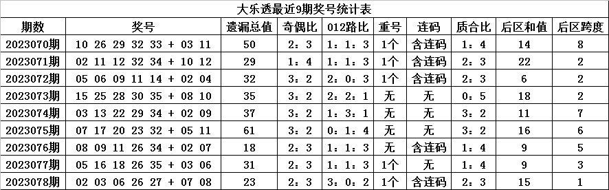 体彩大乐透第2023078期奖号为:02 03 06 26 27 + 07 08,各位号码遗漏期数分别为:6期、3期、5期、0期、9期+1期、4期,前区号码遗漏总期数为23期,012路比为3:0:2,奇偶比为2:3,包含1个重复号码:26。后区号码遗漏总期数为5期,和值为15,跨度为1。