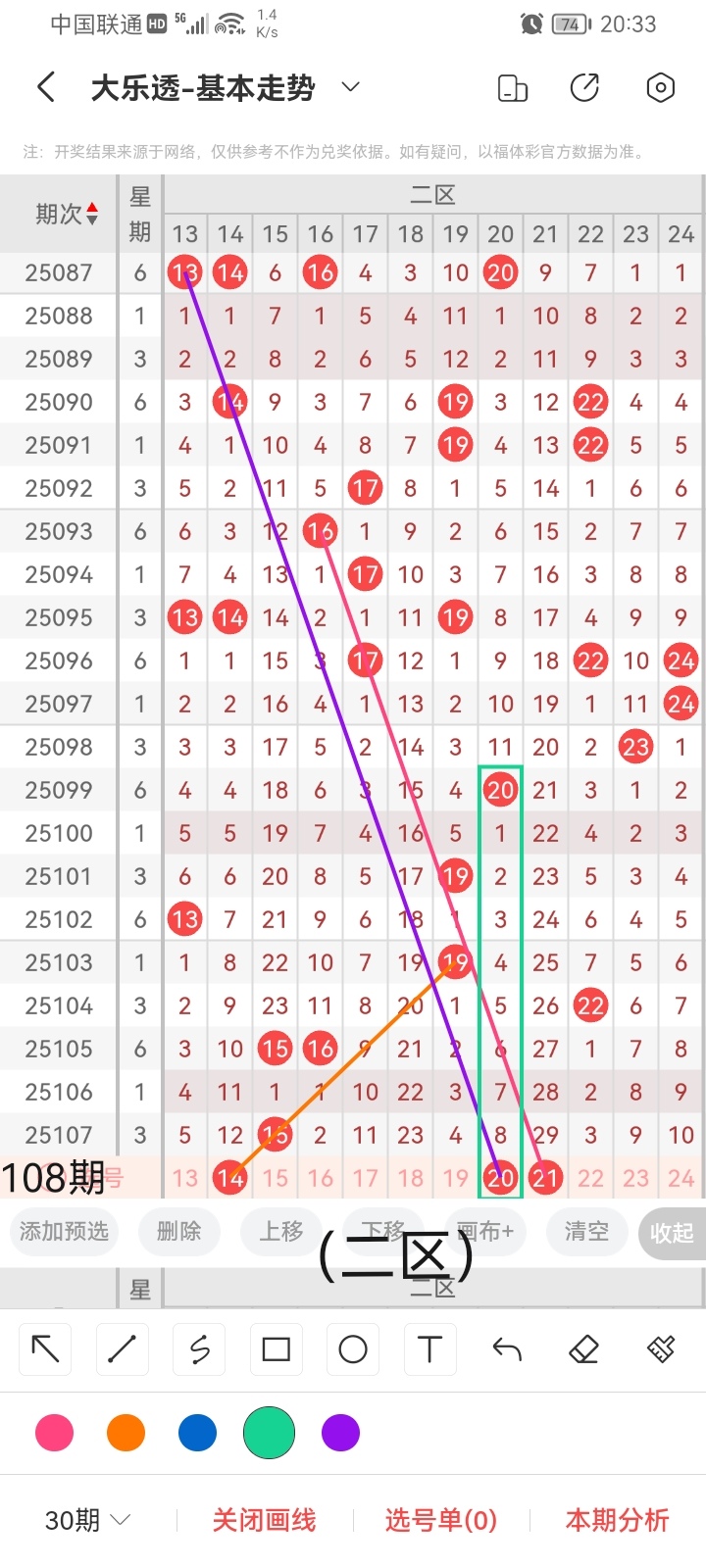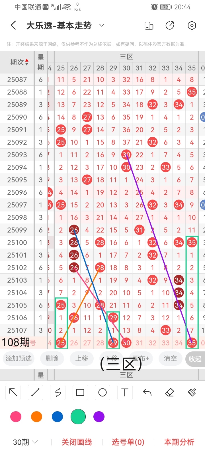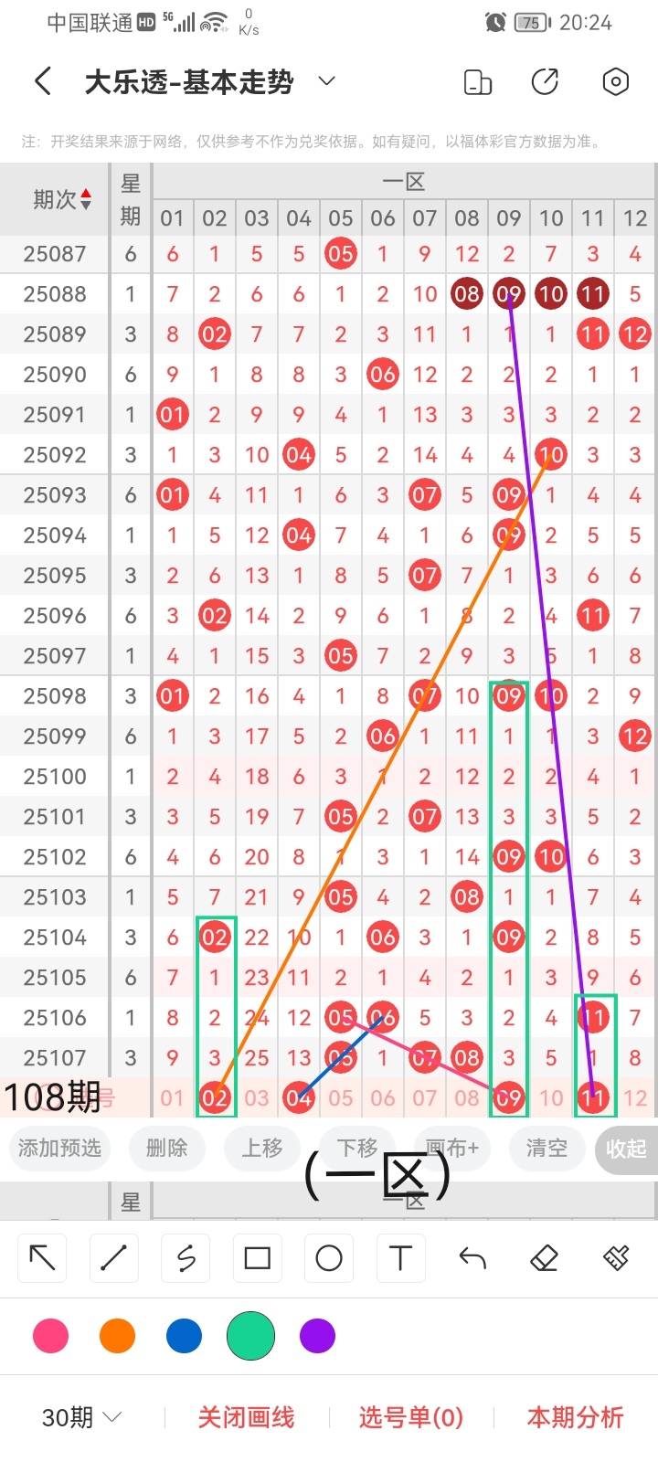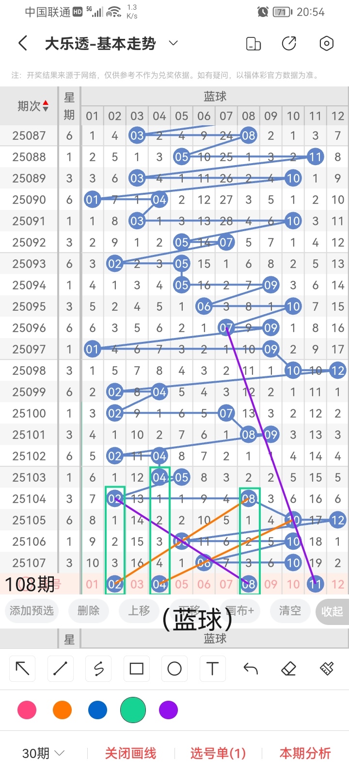 通过以上对上期的简单回顾,下面进入大乐透第2025108期(下面简称本期)的选号分析: