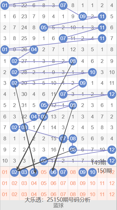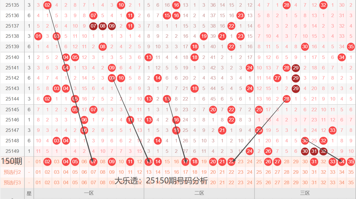 通过上期号码的简单分析,我们看下25150期红色号码球的总体走势,如下图:
