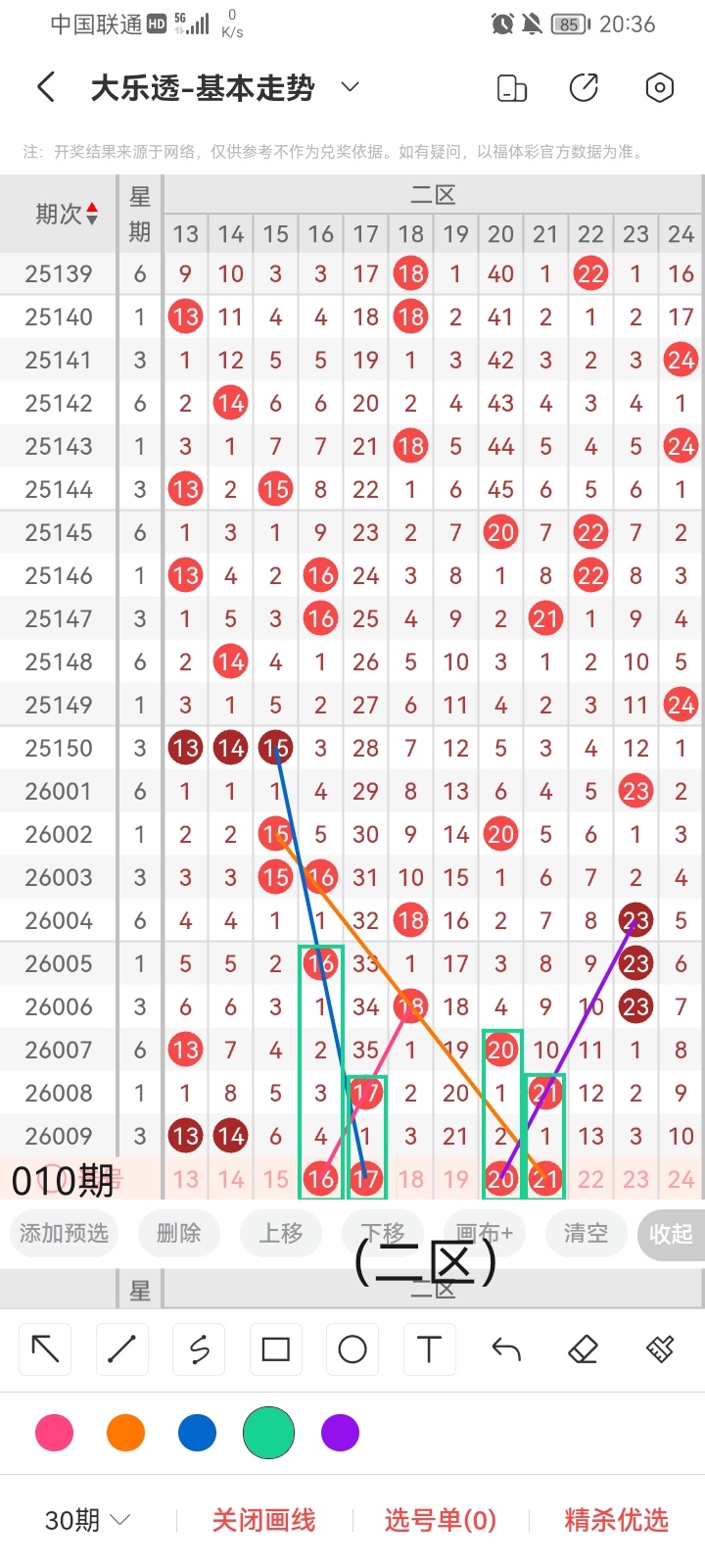 小梁结合上图中画线的思路及走势分析,最后给大家汇总一下大乐透本期红球、蓝球数据,供大家参考: