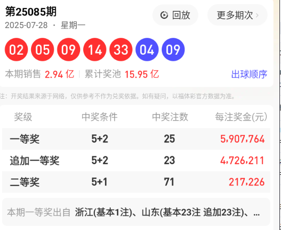 大乐透2025085期开奖结果: