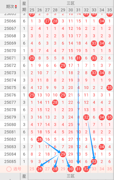 我个人对大乐透号码分析主要有四点。一、采用遗漏数据,把所有号码分三类(热号)(温号)(冷号),二、区间比出号情况,三、查阅前三年对应期数开奖号码对比分析,四、再结合和值大小走势进行分析选号。