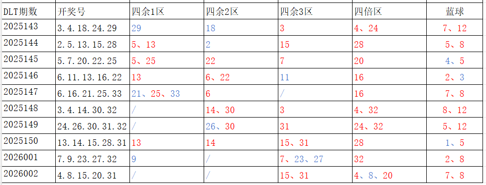 分享第一个数据分析:四分区统计数据。相对于传统的三分区,个人习惯使用四分区,就是把35个红球号码除以4,所得的余数分区如下:
