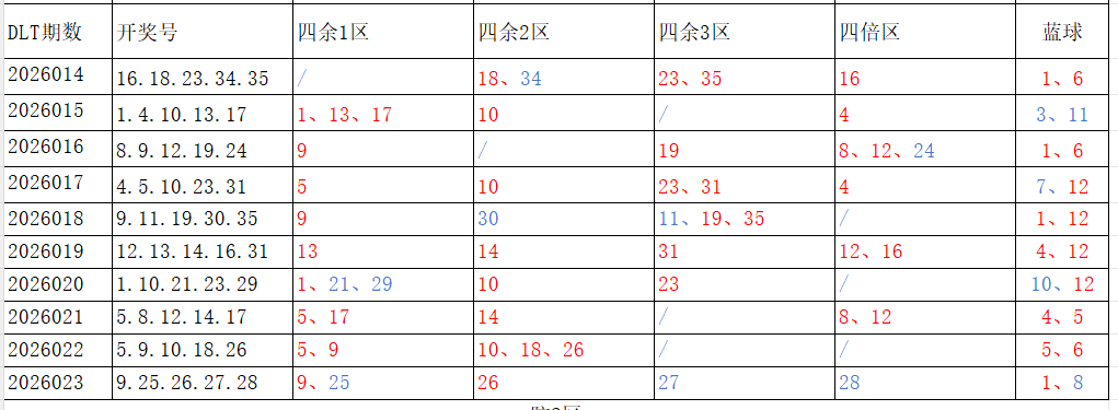 分享第一个数据分析:四分区统计数据。相对于传统的三分区,个人习惯使用四分区,就是把35个红球号码除以4,所得的余数分区如下: