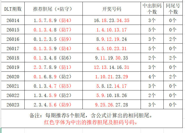 如图,每期推荐胆尾中出1-4个。上期推荐胆尾中出3尾3码!推荐胆尾是按照公式计算的顺序,不定位红球号码的顺序。本期推荐胆尾:1尾/0尾/4尾/6尾/2尾,加推防守胆尾+胆码号码:***(会员专区可见)。个人分析,仅供参考。