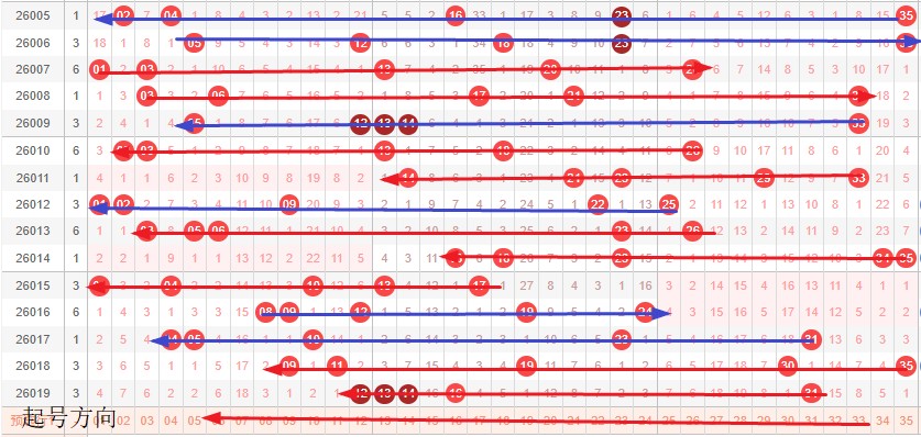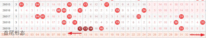 如图所示:首尾制约平衡组范围依次为:推推拉,推缩? 本期形态范围优先选择红色拉伸首尾。由于上期号码处在首尾换4然后中间右推本期交换首尾移动空间连续分割形成间隔1正在重复走势预计本期继续形成走势,本期宜采取继续左推走势常规起号,或体现重号和间隔1走势。