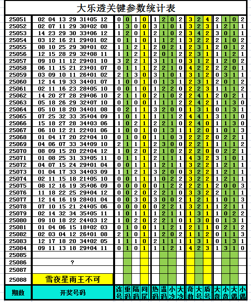 以下是作者手工统计的大乐透关键参数统计表,对喜欢参数分析、过滤缩水、选号胆杀的技术性大乐透爱好者有所帮助,其它读者可略过不看。