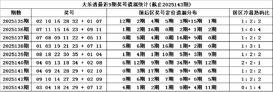上期没有开出冷码,近9期冷码表现非常活跃,目前前区有6个冷码:061720252631,本期注意温热号码反弹,防冷码全部轮空。