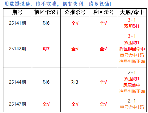 上期前区杀8码全对,公推前区杀4码全对,后区杀3码全对。大底命中2+1,本期再接再厉!