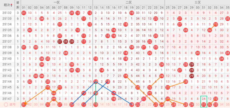 三区(25-35)分析:上期该区开出号码 25 33,近10期占比20%,与上期相比-2%。本期无三斜连号趋势,无隔码斜连走势。