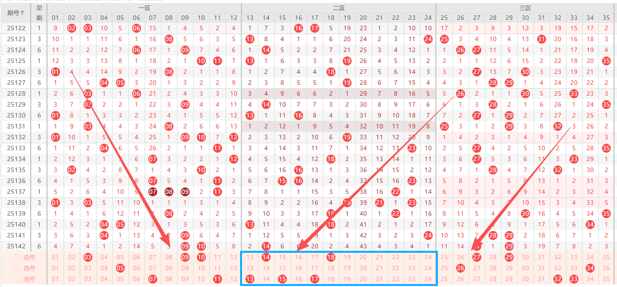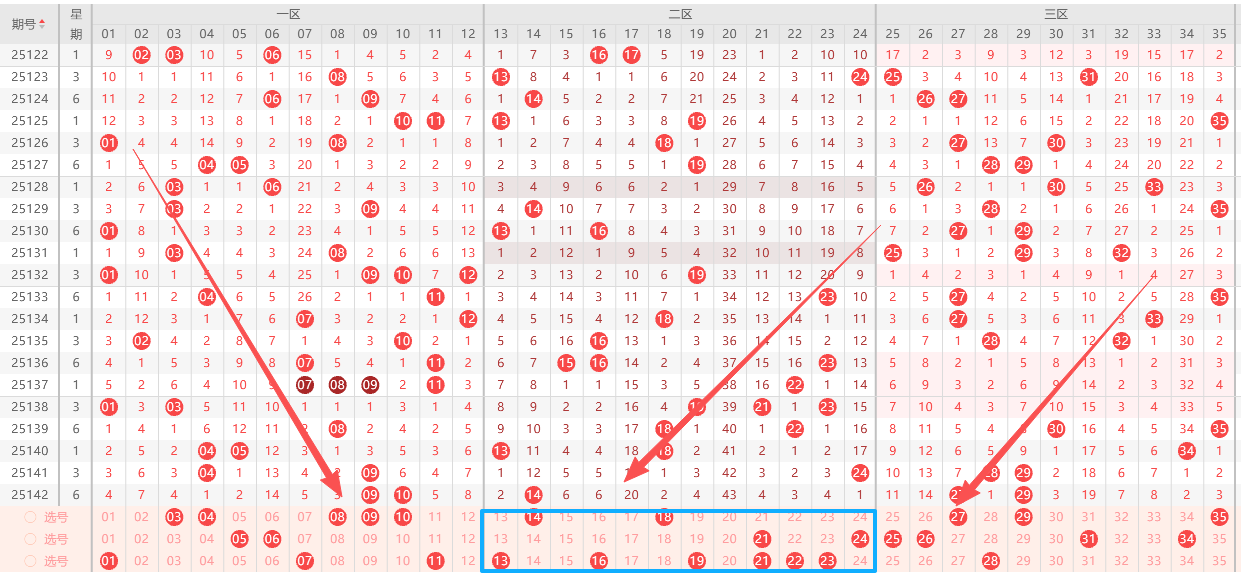 第三区:本期的凤尾,可以考虑32和33,34几个号码,3区号需要考虑26, 27和28这几个号码。