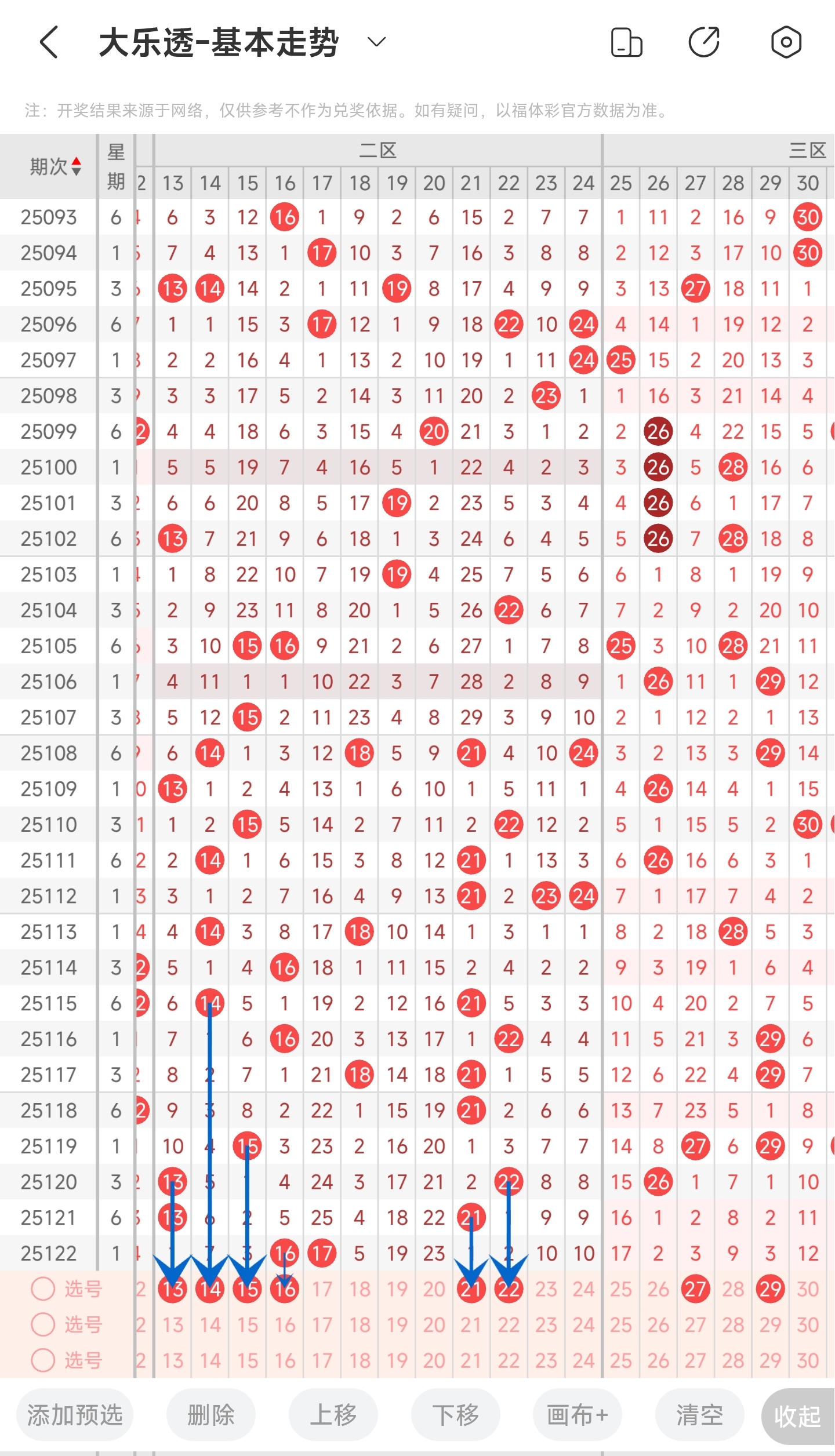 上一期开出了16,17等号码,往前一期开出了13,21号球。通过分析走势图,可以看到二区整体上开出的号码比较稳定,开出的号码都在2个左右,变化不是太大,本期也可以继续关注。从开出的号码来看,近期左右两边的号码比较常开出,可以重点关注。再结合遗漏情况和冷热号,本期我们可以关注13,14,15,16,21,22等号。综上所述我们可以推测本期可能会开出有13,14,15,16,21,22等号码。