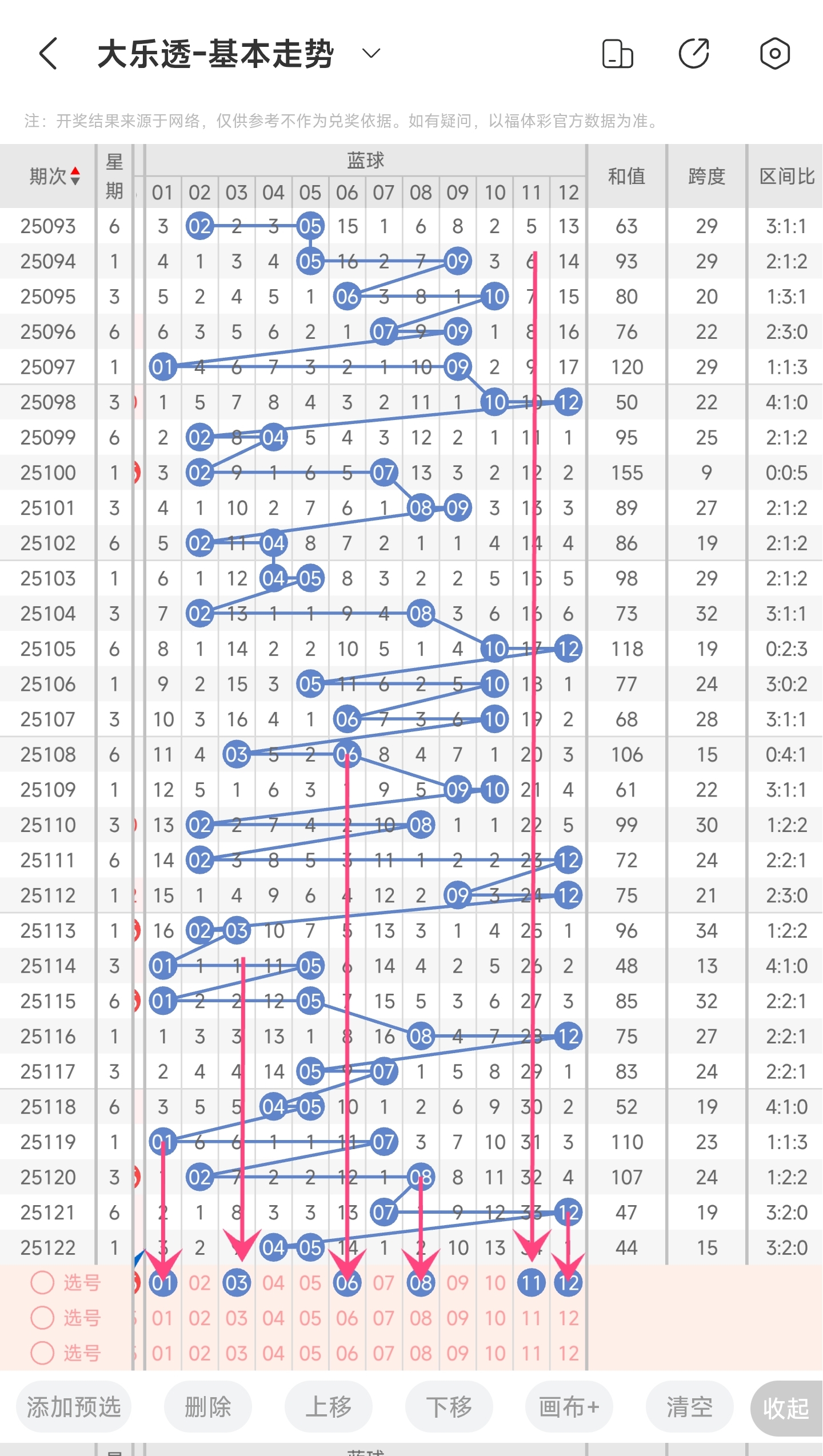 上期龙头为2,凤尾为17,跨度为15。而近5期跨度为19,23,24,19,15。均值为21.8。上期跨度为20,往前一期为15,偏移量为19,振幅为4。跨度为15时,跨度值是最近30期内开出的比较小的值,下降的空间比较小,上升的空间很大,上期凤尾开在了二区,本期推测会回补到三区,且近30期内开出小跨度值的情况比较少,所以推测本期跨度大概率会变大,小概率变小。。