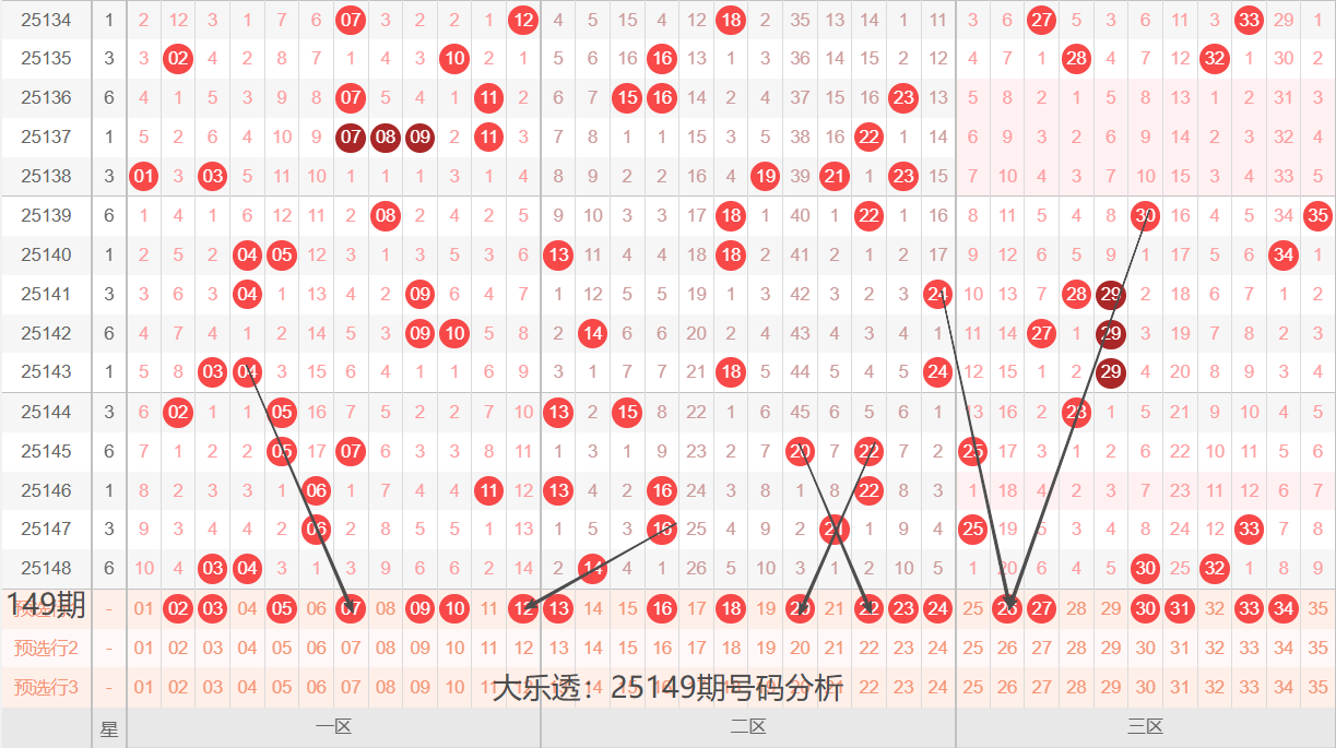通过上期号码的简单分析,我们看下25149期红色号码球的总体走势,如下图: