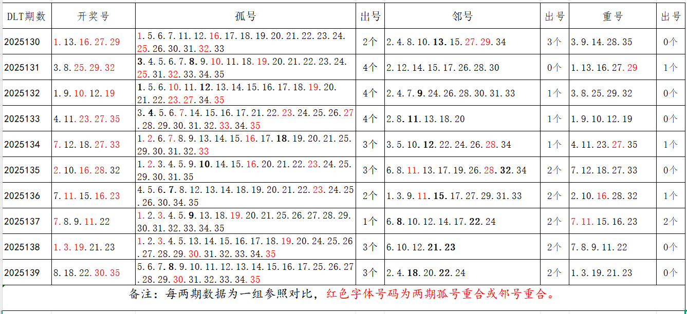 如图,以近两期数据为一组,进行对比分析,相同的孤号、邻号可能在下期开出。本期参考孤号:1.2.3.4.5.6.10.11.12.13.14.15.16.20.24.25.26.27.28.32.33;邻号:7.9.17.19.21.23.29.31.34。重点关注:孤邻号重合号码:***(会员专区可见)。个人分析,仅供参考。