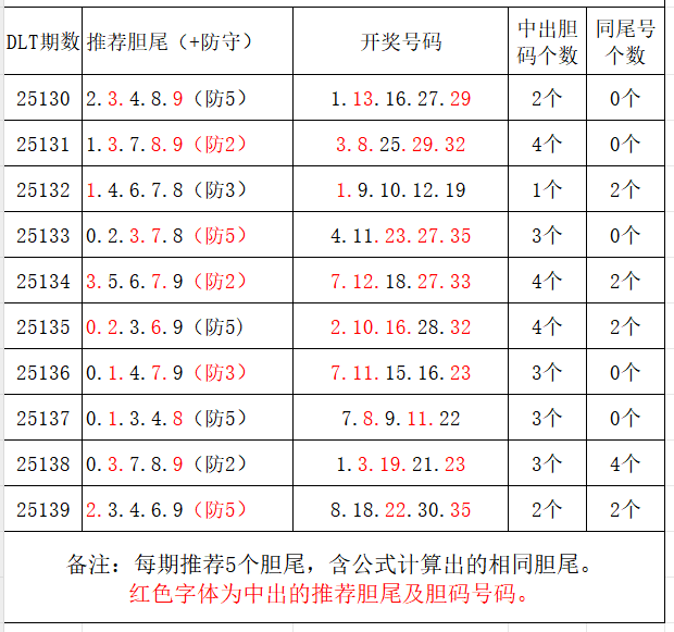 如图,每期推荐胆尾中出1-4个。上期推荐胆尾中出2尾2码!推荐胆尾是按照公式计算的顺序,不定位红球号码的顺序。本期推荐胆尾:3尾/5尾/1尾/9尾/6尾,加推防守胆尾+胆码号码:***(会员专区可见)。个人分析,仅供参考。