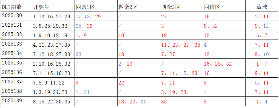 分享第一个数据分析:四分区统计数据。相对于传统的三分区,个人习惯使用四分区,就是把35个红球号码除以4,所得的余数分区如下: