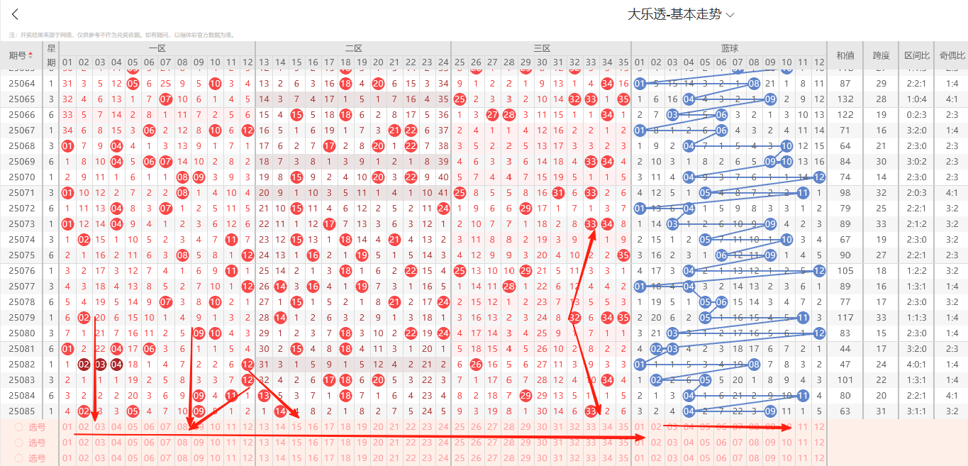 2、后区:上期开出04 09,从后区整体走势来看在大部份开奖结果中频繁有重码或者邻码的开出,根据重号出号频率本期预防03 04 05 08 09 10中有号码落下。综合后区本期关注03 05 08 11 12。有关其他具体详细号码及周期走势分析关注11:05~12:30选号思路详细解析的直播解析。