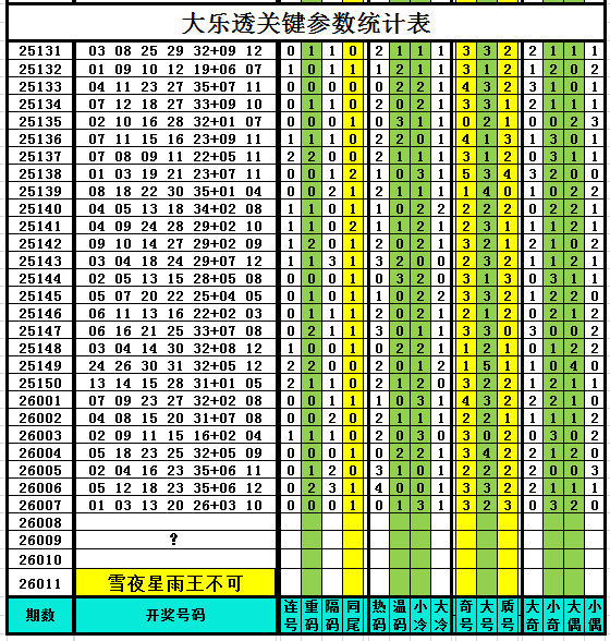 以下是作者手工统计的大乐透关键参数统计表,对喜欢参数分析、过滤缩水、选号胆杀的技术性大乐透爱好者有所帮助,其它读者可略过不看。