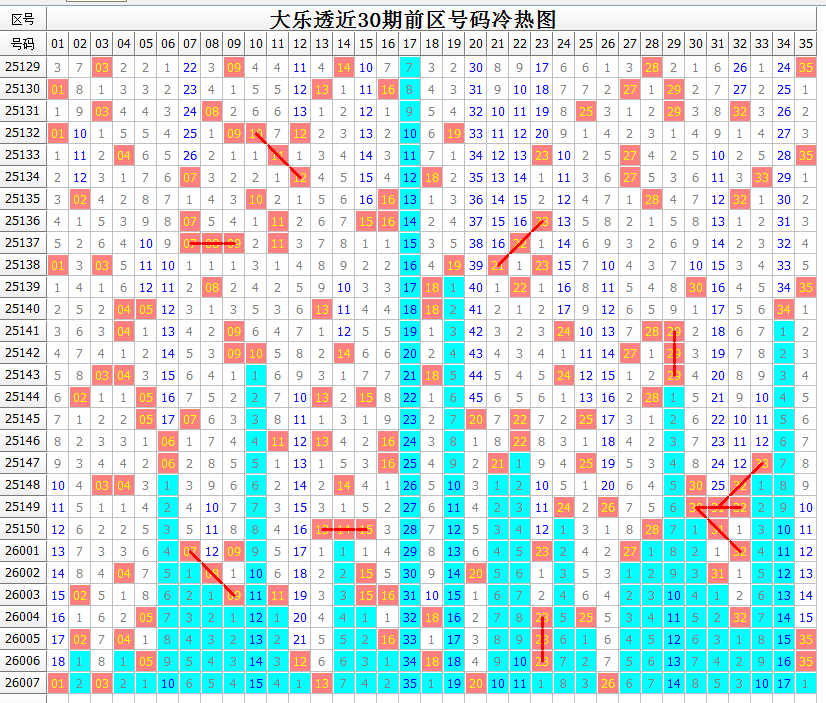 上期热、温、小、大冷0131组合形态。追踪数据请参考前面的大乐透关键参数统计表。