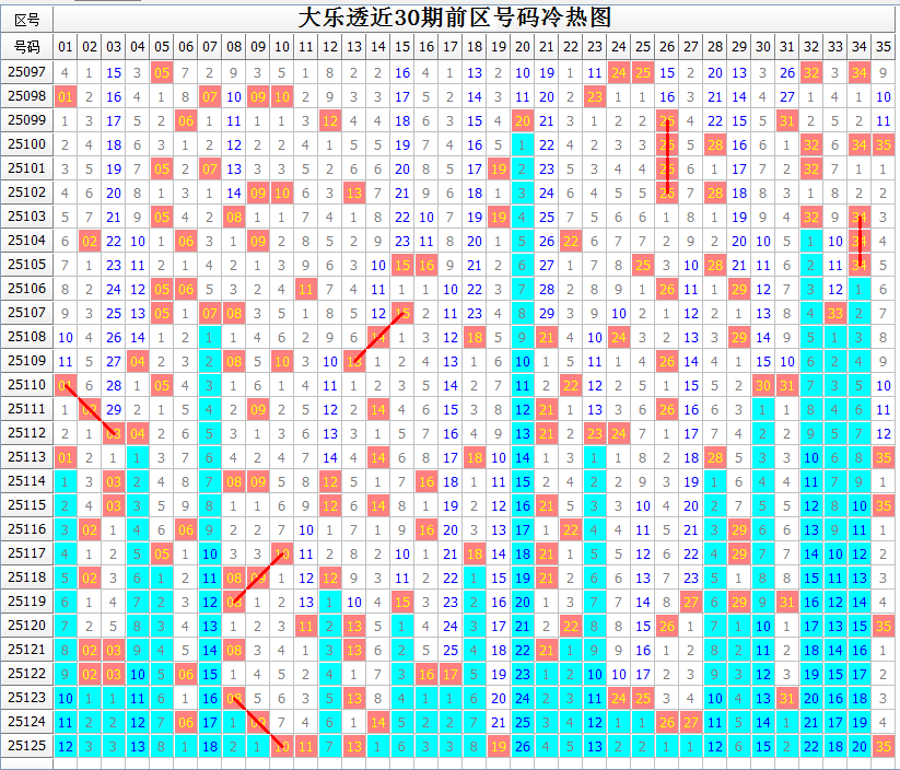大乐透近30期前区号码冷热图(数字为遗漏期数,蓝色标记的为遗漏超过10期的大冷号)