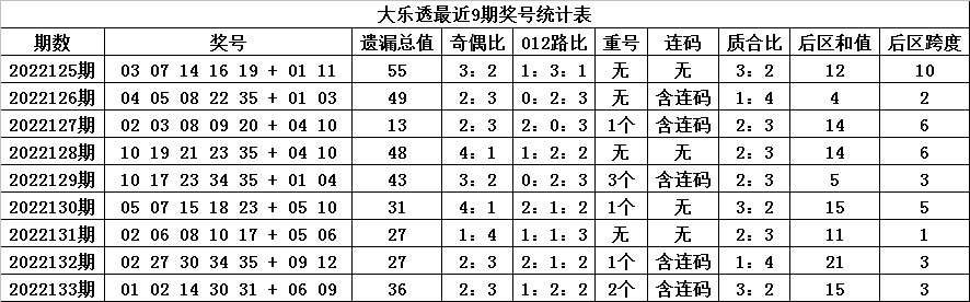 体彩大乐透第2022133期奖号为:01 02 14 30 31 + 06 09,各位号码遗漏期数分别为:13期、0期、7期、0期、16期+1期、0期,前区号码遗漏总期数为36期,012路比为1:2:2,奇偶比为2:3,包含2个重复号码:02、30。后区号码遗漏总期数为1期,和值为15,跨度为3。