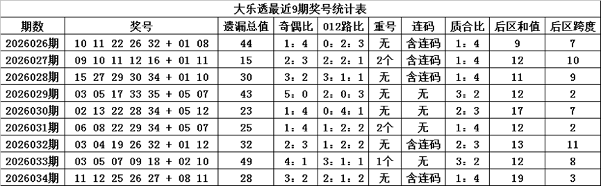 后区跨度:后区近9期跨度分别开出7-10-9-2-7-2-11-8-3,跨度奇偶比为5:4,上期跨度下降5个点位,本期防跨度再次下降,看好开出偶数跨度,参考跨度2。